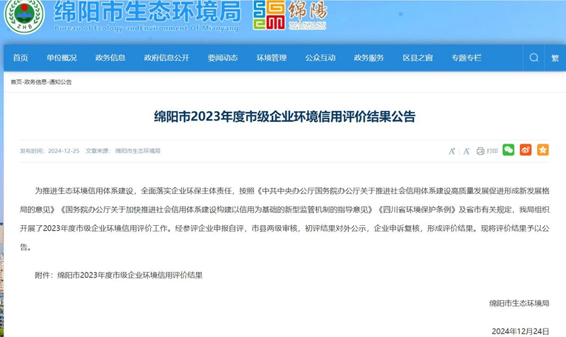 近日,从绵阳市生态环境局发布的关于《绵阳市2023年度市级企业环境信用评价结果公告》中获悉,开云官方注册获评绵阳市2023年度“环保诚信企业”。